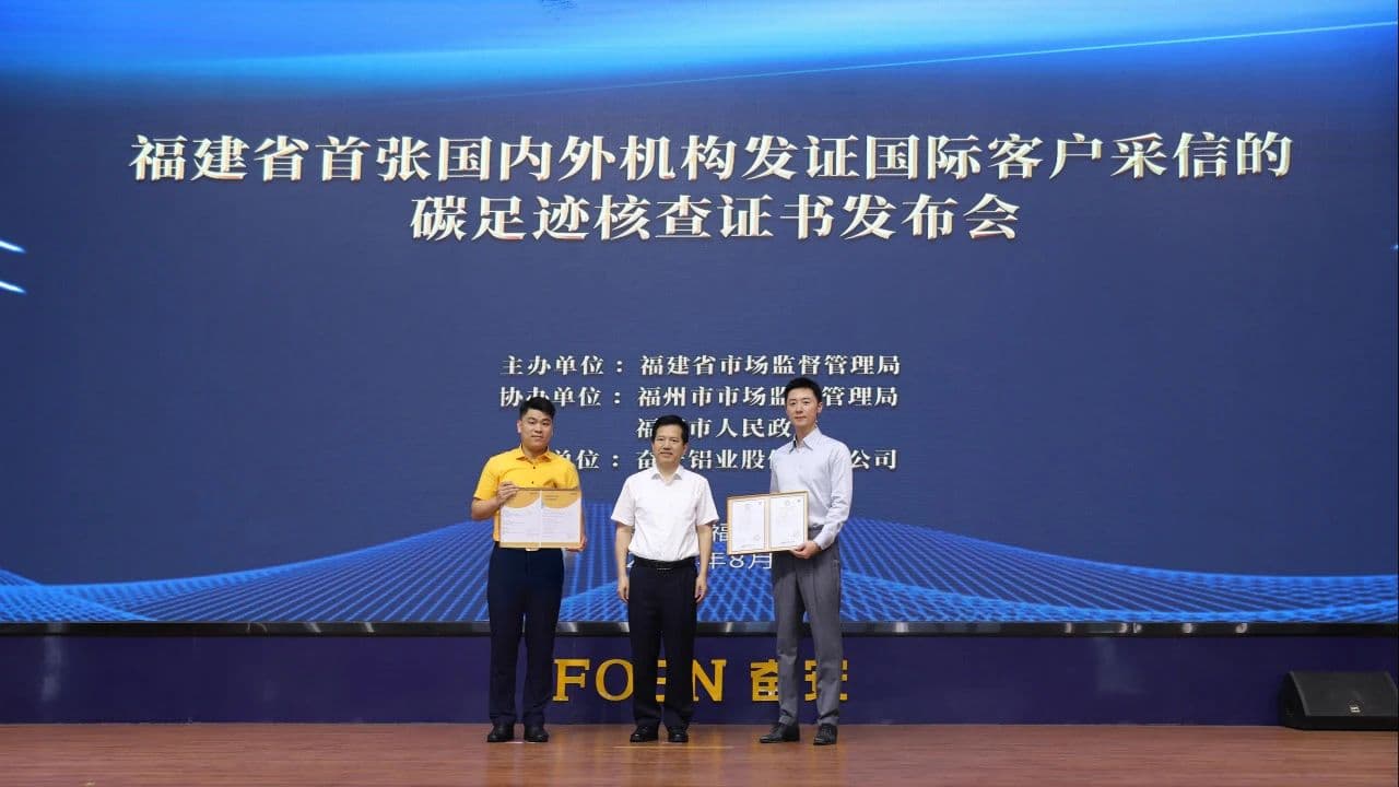 Ngày 19 tháng 8, chứng nhận xác minh lượng khí thải carbon đầu tiên tại tỉnh Phúc Kiến, do các tổ chức chứng nhận trong và ngoài nước cấp và được khách hàng quốc tế công nhận, đã chính thức được trao tại Công ty TNHH Nhôm FOEN. Buổi lễ có sự tham dự của các lãnh đạo gồm có ông Hoàng Thủy Mộc, Bí thư Đảng ủy, Cục trưởng Cục Quản lý Thị trường tỉnh Phúc Kiến; ông Trần Tông Sinh, Bí thư Đảng ủy, Cục trưởng Cục Quản lý Thị trường Phúc Châu; ông Lâm Hòa Chí, Phó Thị trưởng thành phố Phúc Thanh. Tham dự buổi lễ còn có ông Hoàng Phân, Chủ tịch Công ty TNHH Nhôm FOEN, cùng các cán bộ liên quan từ các sở quản lý thị trường tỉnh và Viện Đo lường tỉnh Phúc Kiến, đại diện của Tập đoàn Chứng nhận Nhãn hiệu Chất lượng Trung Quốc và Công ty TNHH Dịch vụ Kiểm tra Intertek (Thượng Hải).